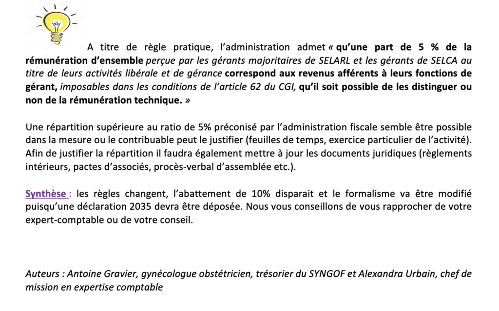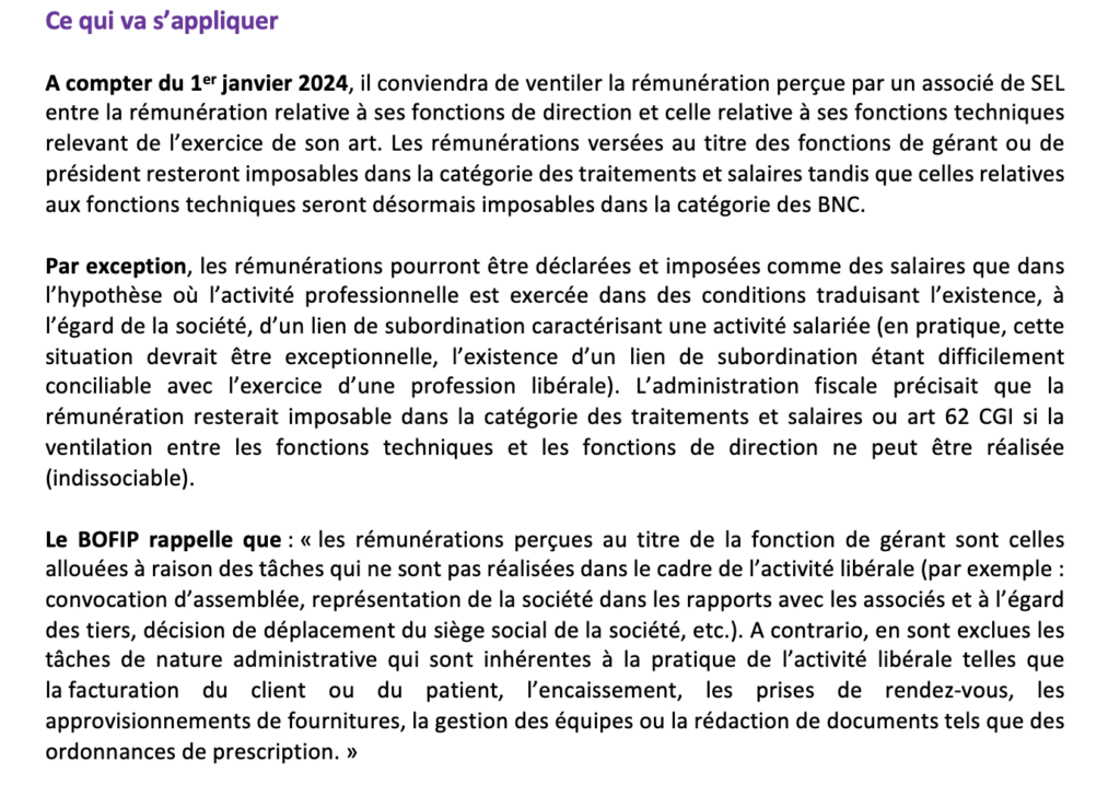L’administration fiscale confirme, à compter du 1er janvier 2024, l’imposition dans la catégorie des BNC des rémunérations techniques des associés de société d’exercice libéral (SEL), l’application initiale était prévue au 1 er janvier 2023.